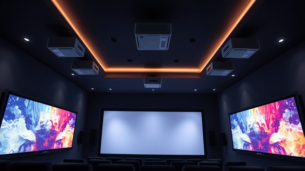 Brightness and contrast play vital roles in how vivid and realistic your home theater visuals appear. Higher brightness, measured in ANSI lumens, guarantees images stay vibrant even in well-lit rooms or outdoor settings. A high contrast ratio, like 100,000:1 or more, deepens blacks and brightens whites, giving images more depth and realism. Together, brightness and contrast determine how well your projector performs under various lighting conditions, making scenes look more lifelike. HDR support further boosts contrast by expanding the dynamic range, revealing more detail in dark and bright areas. Striking the right balance between brightness and contrast is essential for cinematic quality, especially in environments with ambient light. This balance ensures your home theater visuals remain vivid, detailed, and immersive.