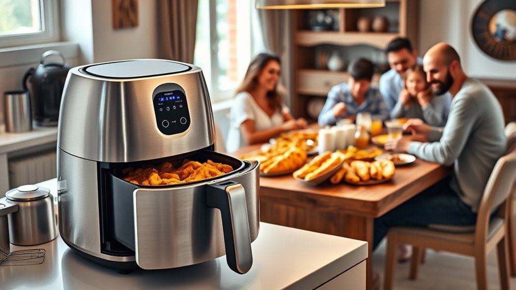 For large families seeking versatile and efficient cooking solutions, the Instant Pot Vortex Plus 6QT XL Air Fryer stands out with its six-in-one functionality and sizable 6-quart capacity. It combines air fry, bake, roast, broil, dehydrate, and reheat modes in a sleek stainless steel design, making it a true all-in-one appliance. With adjustable temperatures up to 400°F and advanced EvenCrisp technology, it delivers crispy results with 95% less oil. The intuitive touchscreen, preset recipes, and app controls simplify meal prep, while features like auto-shutoff and overheat protection guarantee safe, reliable operation. It’s perfect for quick, healthy family meals.