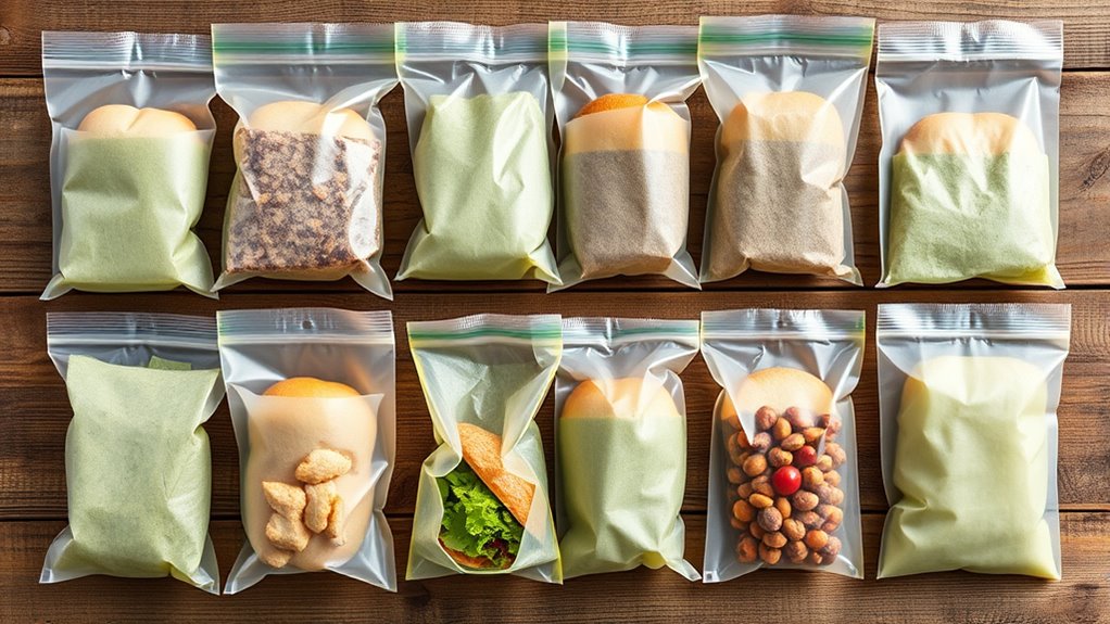 Biodegradable sandwich bags can be just as durable as traditional plastic ones, but it depends on the brand and material used. I’ve found that high-quality options often resist tears and leaks well, making them practical for everyday use. However, cheaper versions might not hold up as long. I recommend choosing reputable brands and checking reviews to guarantee you get a bag that’s both eco-friendly and durable enough for your needs.