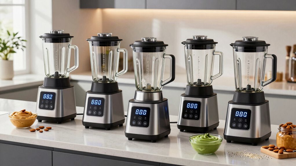 If you’re looking for the best blenders for almond butter and tahini in 2026, I’ve found several standout options. I recommend models with powerful motors of 1000W or more, sharp durable blades, and large capacities for efficient processing. Safety, easy cleaning, and sturdy construction are also key. I’ve narrowed down the top five, and if you keep exploring, I’ll help you find the perfect fit for your needs and budget.