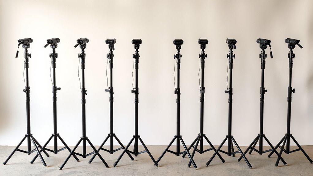 The height adjustability range of heavy-duty C-stands is essential for creating versatile lighting setups, as it determines how high or low your equipment can be positioned. Typically, these stands range from about 4.8 feet to over 10 feet, thanks to adjustable center columns with telescopic sections. This flexibility allows me to adapt quickly to different shot requirements, whether I need overhead lighting or low-angle shots. The maximum height is crucial for shooting tall scenes or working with larger modifiers, while the minimum height helps with close-up or low-angle work. Locking clamps or knobs are vital for securing the height once set, ensuring stability during use. Overall, a broad adjustability range enhances the stand’s usability across various filming scenarios.
