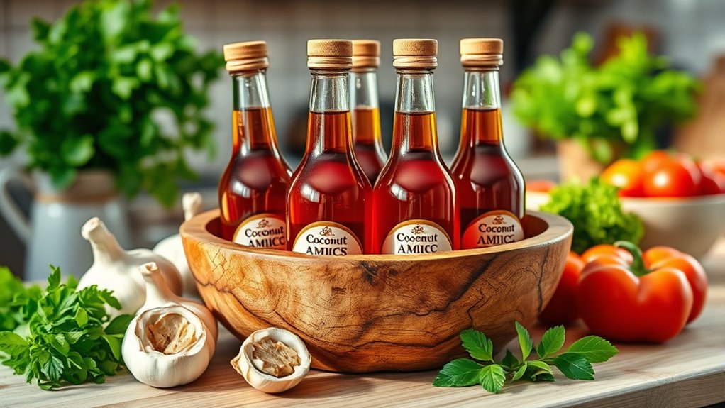 If you want to improve your healthy cooking with less salt, I recommend checking out the 14 best low-sodium coconut aminos. These products are made from organic, natural ingredients and offer a savory umami flavor perfect for marinades, stir-fries, and dressings. They contain considerably less sodium than soy sauce and support various dietary needs like paleo and vegan. Keep exploring to discover which options suit your taste and cooking style best.