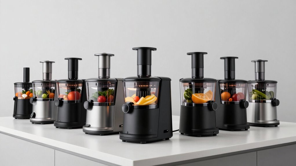 A quiet motor is essential for a pleasant juicing experience, especially if you want to avoid disturbing others or enjoy early morning sessions. Typically, these motors operate below 60 decibels, ensuring low noise levels. Higher wattage motors offer more power and efficiency, but it’s important to balance this with noise considerations. Slow masticating juicers, running at around 55-60 RPM, maximize juice extraction while keeping noise down. An efficient motor with features like auto-reverse and overload protection can boost performance without increasing noise levels. Ultimately, choosing a juicer with the right combination of power and optimized speed settings guarantees you get the most nutrients from your produce without sacrificing quiet operation. This balance is key to a satisfying juicing experience.