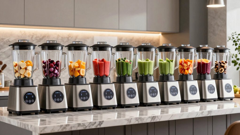 Choosing a commercial blender for your home kitchen hinges on its power and performance, which directly impact how well it handles tough ingredients and heavy-duty tasks. A strong motor, typically between 1000W and over 2200W, guarantees efficient blending and smooth textures. Blenders with RPMs above 20,000 can crush ice and frozen fruits quickly, saving you time and effort. Variable speed controls and preset programs give you precise control over textures, making it easy to customize for different recipes. Many commercial-grade models feature overload protection and thermal shutoffs, preventing motor burnout during intensive use. Ultimately, performance depends on blade quality, motor strength, and jar design, all of which influence blending efficiency and the quality of your results.