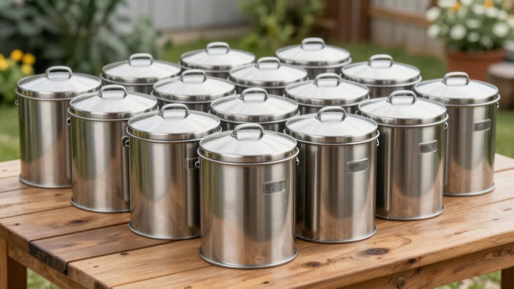 Think of a stainless steel compost bin as a knight in shining armor protecting your compost. Yes, you can use it outdoors effectively! Its durability and resistance to rust make it an ideal guardian against the elements. Just guarantee it’s placed in a shaded area and cleaned occasionally. With proper care, your stainless steel bin will serve you well, transforming organic waste into rich soil, no matter the weather.