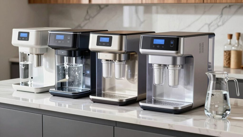 Choosing the right filtration technology for your countertop system involves understanding how each type targets specific contaminants. Reverse osmosis systems remove over 99% of dissolved solids, heavy metals, and pathogens, delivering highly purified water. Activated carbon filters excel at reducing chlorine, odors, and organic compounds, which enhances taste and smell but may not eliminate dissolved inorganics. Ultrafiltration uses fine membranes to remove bacteria, cysts, and sediment without substantially affecting mineral content or TDS levels, making it a good all-around option. UV light disinfection effectively neutralizes bacteria and viruses but doesn’t remove chemical contaminants or dissolved solids. Considering your specific water quality and what contaminants you want to eliminate helps determine which technology best suits your needs.