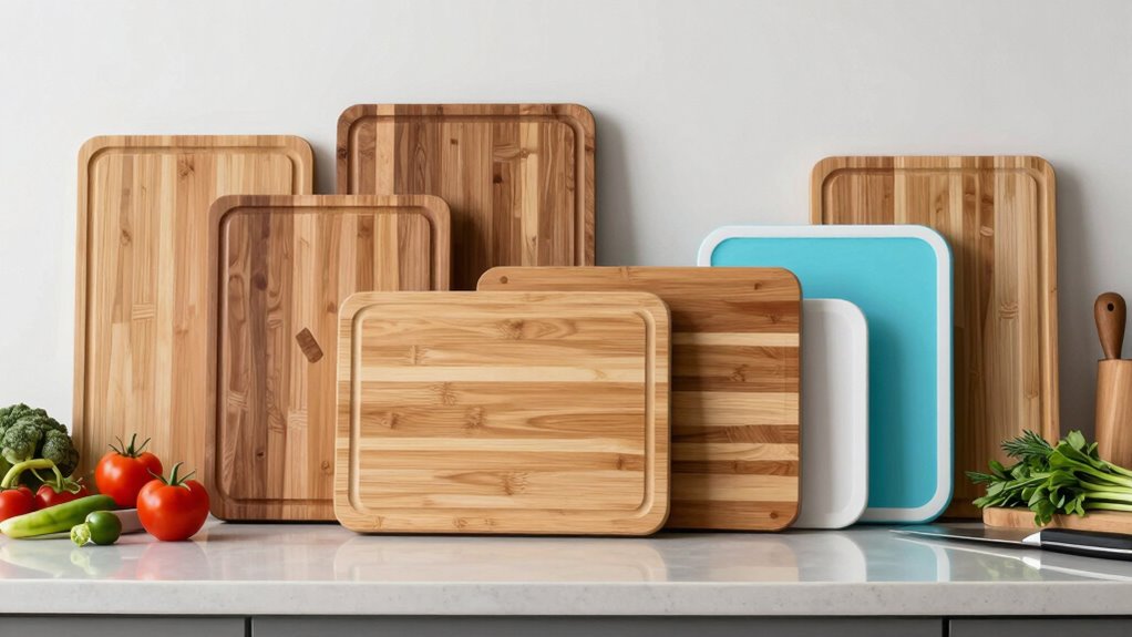 Did you know nearly 70% of kitchen waste could be reduced with eco-friendly options? I believe there are great sustainable cutting boards for frequent meal prep. I personally prefer bamboo because it’s renewable, durable, and naturally antimicrobial. Plus, it looks stylish on my countertop. Switching to bamboo or recycled plastic boards helps me cut waste and stay eco-conscious without sacrificing quality or safety in my meal prep routine.