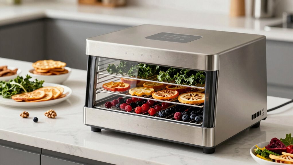 If you’re searching for the 15 best dehydrators for raw vegan snacks in 2026, I’ve got you covered. These models feature precise temperature controls, large capacities, and even airflow to preserve nutrients and guarantee even drying. From compact home units to commercial-grade options, they make raw snacking easier and more efficient. Stay tuned, as I’ll share detailed insights on top brands, key features, and what to take into account for your healthy snack adventures.