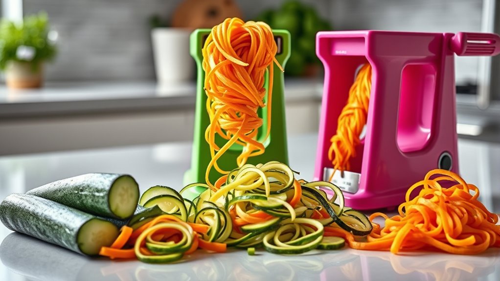 Just like Daedalus crafted wings to elevate us, choosing the right dishwasher-safe spiralizer lifts your veggie prep to new heights. With the right tool, effortless slicing becomes second nature, turning everyday ingredients into culinary art. Remember, the perfect spiralizer isn’t just about convenience, but about transforming routine into innovation. So, embrace these top picks, and let your kitchen adventures soar—because great flavors deserve the wings of the best tools.