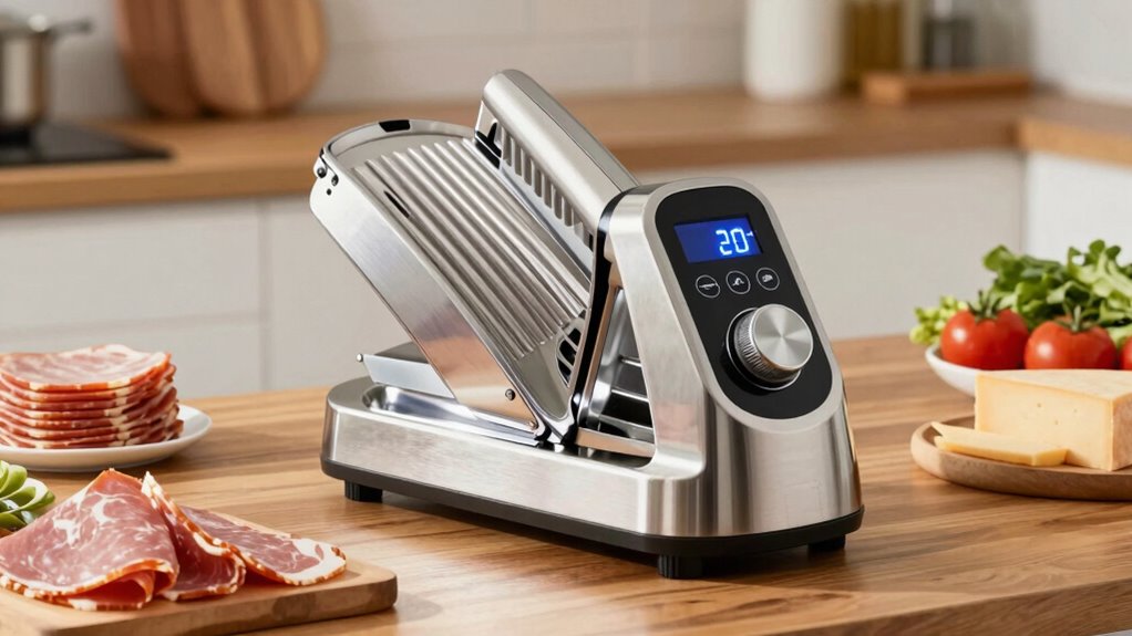 Choosing the right electric food slicer transforms your kitchen into a gourmet deli, where each slice is perfectly uniform and effortlessly precise. As you glide through meats and cheeses, the sleek blades and adjustable thickness become an extension of your culinary artistry. Imagine the satisfying crunch of a perfectly sliced ham or cheese, all made possible with these top-tier slicers. Elevate your food prep and savor the craftsmanship behind every slice—your deli-style experience awaits.