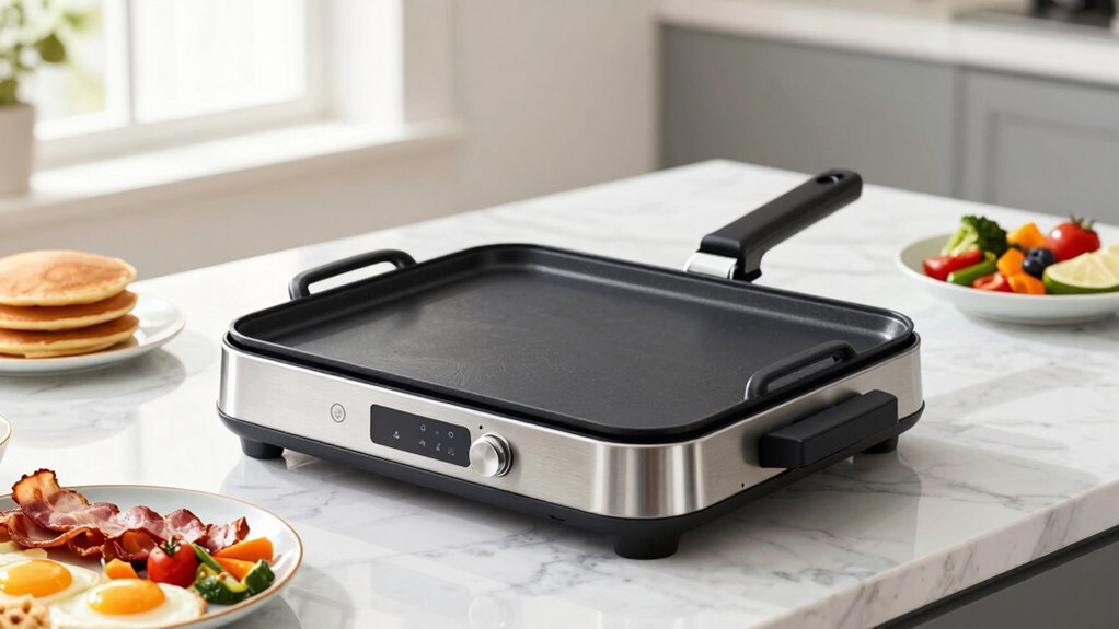 Electric griddles are pretty power-efficient for daily meal prep, I’ve found. They heat quickly, use less energy than full-sized ovens, and distribute heat evenly, which minimizes wasted wattage. Plus, because they’re compact, they focus energy exactly where it’s needed. So, I’d say they’re a smart, sustainable choice for busy cooks aiming to save energy without sacrificing efficiency or excellence in their everyday meals.