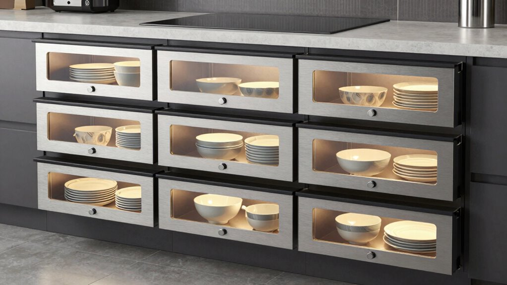 Modern food warmer drawers come with several safety features to keep you protected. I’ve found that they often include automatic shut-off, preventing overheating or accidental fires. Many models also have cool-touch exteriors, so you won’t burn yourself. Some even feature temperature controls and alarms to alert you if something’s wrong. Overall, these safety features give me peace of mind while keeping my food warm and ready to serve.