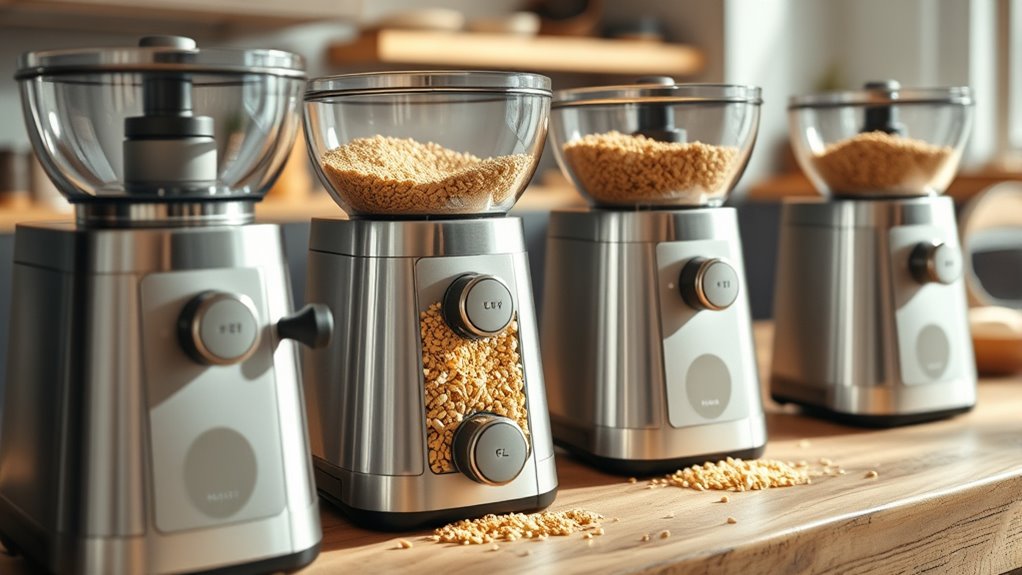 Choosing a heavy-duty wheat grinder hinges largely on its motor strength, since a powerful motor guarantees efficient, fast grinding of tough grains. Typically, these grinders have motors ranging from 1500W to 3000W, which ensures they can handle large batches without overheating. A higher wattage means quicker processing and the ability to grind dry, hard wheat kernels smoothly. A robust motor with high torque minimizes chances of stalling or clogging, even with dense grains. Additionally, the motor’s build quality—including durable components like capacitors and shafts—affects its long-term reliability. Adequate motor strength is essential for maintaining consistent particle size and reducing grinding time, especially if you plan to grind frequently or in high volumes. This ensures efficiency and dependability during heavy use.