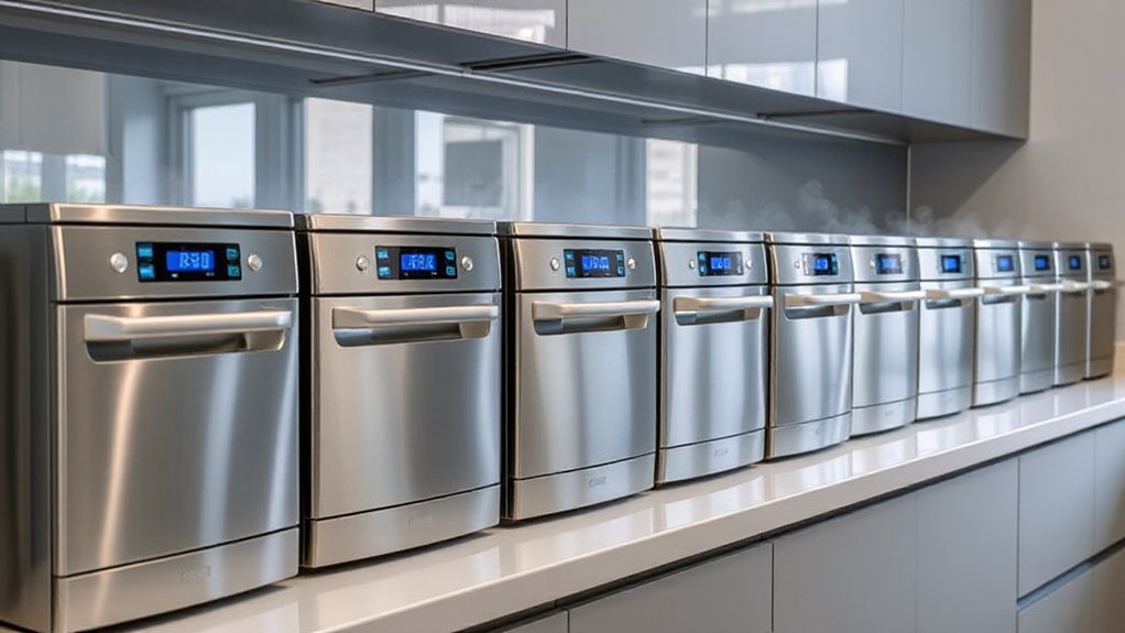 Did you know that high-temperature dishwashers can use up to 30% more energy than standard models? I believe they aren’t necessarily less efficient overall because they sanitize more effectively, reducing the need for additional cleaning. While they do consume more power, their superior hygiene benefits often outweigh the extra energy use. So, if sanitation is your priority, these dishwashers can be a smart, efficient choice.