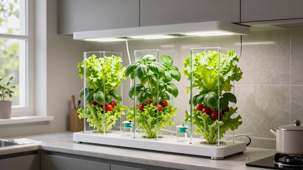 No matter how limited your space, a hydroponic garden can transform your kitchen into a lush oasis. I get it—space is tight, and you might think you can’t grow fresh herbs or veggies easily. But these compact systems prove otherwise! They’re designed to fit small kitchens and make gardening simple. With a little effort, you’ll enjoy fresh produce anytime, without the hassle of traditional gardening. Give it a try—you’ll be amazed at how much you can grow!