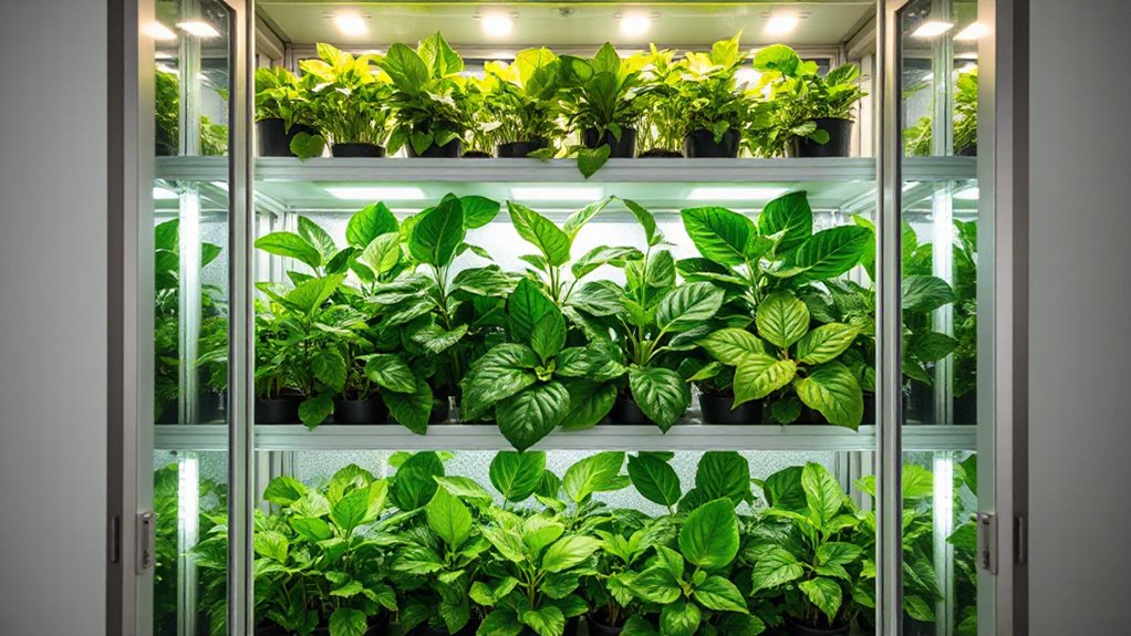 Did you know that energy-efficient grow lights can reduce power consumption by up to 50%? Yes, these cabinets often come with LED grow lights designed for ideal plant growth while saving energy. I’ve found that switching to LED options not only cuts costs but also produces less heat, making your indoor gardening more sustainable and manageable. So, yes, energy-efficient grow lights are definitely available for these cabinets.