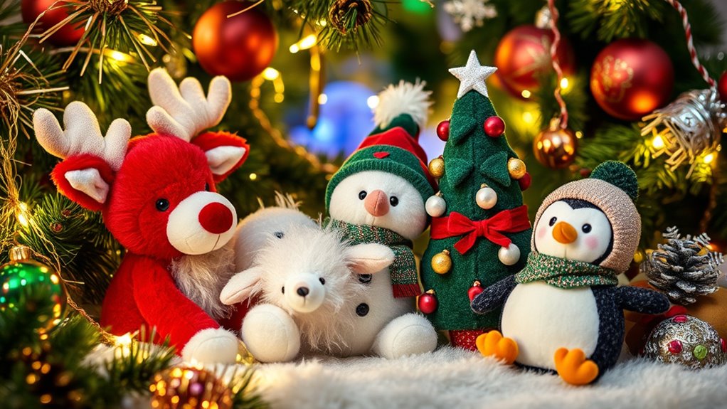 Selecting the right material and guaranteeing durability are key factors when choosing Jellycat Christmas toys for 2025. I recommend opting for plush toys made from high-quality, 100% polyester fabrics—they’re soft, subtle, and built to last. Look for items with multi-layer construction and hand-finished details, which help maintain their shape and visual appeal over time. Safety standards like EN71 are essential, as they ensure the toys are safe for all ages and resistant to wear and tear. Carefully sewn or attached components, such as hard-attached eyes, prevent parts from coming loose. Choose designs with thoughtful features that keep their softness and shape through multiple holiday seasons and frequent handling, making them a reliable, festive addition to your collection.