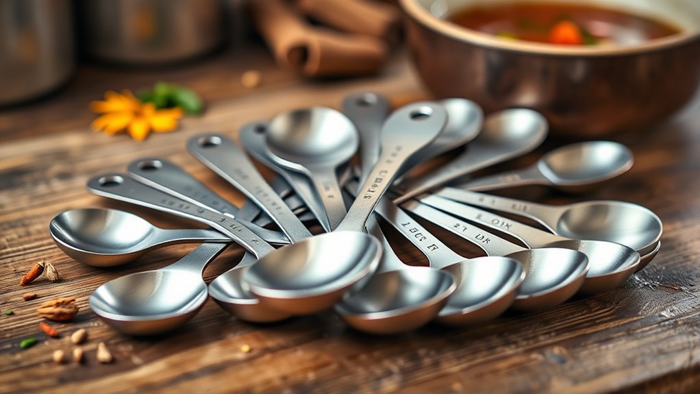 Ever notice how the design of your measuring spoons can influence the overall look of your kitchen? Choosing aesthetically pleasing spoons can elevate your space and reflect your personal style. Sleek finishes like matte, polished, or brushed stainless steel give a modern vibe that complements contemporary decor. Colorful or uniquely shaped handles not only add visual interest but also make it easier to identify sizes quickly. Clear, consistent measurement markings—whether engraved or printed—help keep your space tidy and give a professional feel. Coordinating design elements, such as matching colors or styles with other utensils, create a cohesive look throughout your kitchen. Prioritizing design aesthetics ensures your measuring spoons are both functional and an attractive addition to your culinary space.