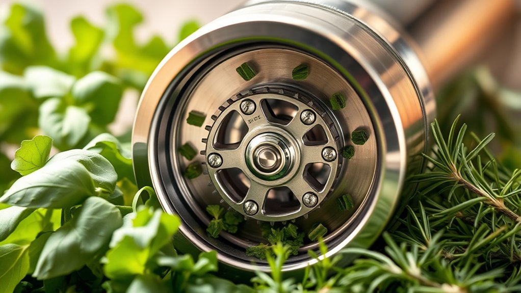Keeping my herb grinder clean is just as important as how I use it. I look for models with removable, dishwasher-safe parts or easy-to-clean components to make maintenance simple. Regularly brushing the blades and chamber with included cleaning tools or soft brushes helps prevent residue buildup and keeps the grinder functioning smoothly. I avoid water exposure to motorized parts unless the grinder is explicitly water-resistant or waterproof, as moisture can cause damage. Some grinders have splash-proof or transparent covers, which help me monitor cleanliness and reduce mess during grinding. Accessibility is key—choosing a grinder with straightforward disassembly allows me to clean thoroughly and extend its lifespan, ensuring consistent performance and longevity.