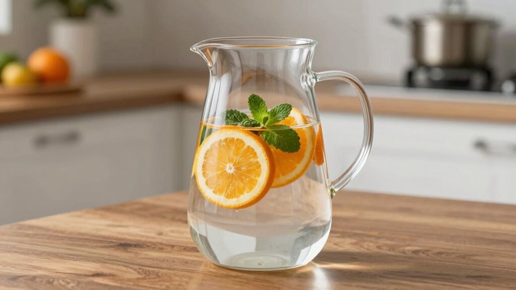 I believe glass pitchers are the best for maintaining infusion flavor because they don’t absorb odors or flavors, keeping your water tasting fresh. They’re also non-reactive, so your infused flavors stay pure. Plus, glass is easy to clean and looks elegant. I’ve found that plastic or metal pitchers can sometimes alter or dull the taste, so I always prefer glass for the freshest, most vibrant infusion experience.