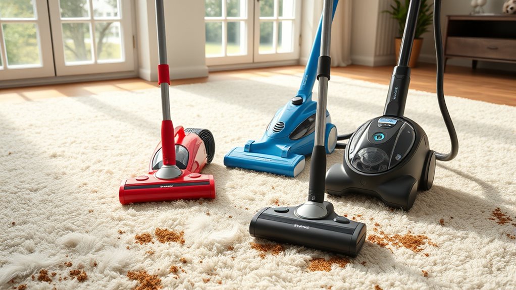 Choosing a portable carpet cleaner for pet stains requires paying close attention to its suction power and ability to lift deep-seated messes. Strong suction is essential for removing embedded pet urine, feces, vomit, and dirt from carpets and upholstery. Using specialized pet stain and odor removal formulas considerably boosts the cleaner’s effectiveness in permanently eliminating odors and stains. Features like heat and agitation help loosen stubborn messes, making cleaning more efficient. A large water tank allows for longer cleaning sessions without frequent refills, increasing the chance of thorough removal in a single pass. Additionally, regularly using enzymatic or oxygen-based solutions enhances stain and odor removal compared to standard cleaners. These factors are vital for choosing a device that truly handles pet messes effectively.