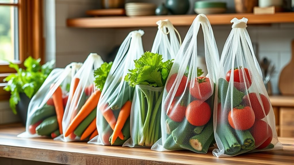 Reusable produce bags can help reduce cross-contamination, but they’re not foolproof. I always recommend dedicating specific bags to different produce types or washing them thoroughly between uses. It’s like giving your grocery routine a little extra TLC. While they do a good job, a bit of mindful organization and cleaning guarantees your fruits and veggies stay fresh and safe, making your eco-friendly efforts even more effective.