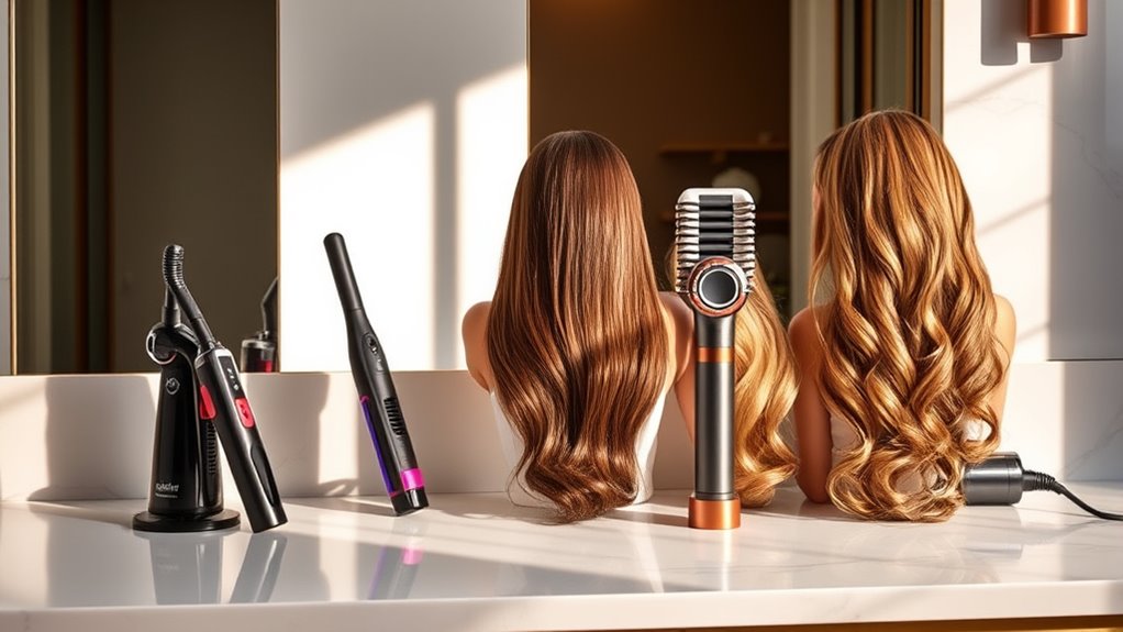 When choosing between the Shark FlexStyle and Dyson Airwrap, understanding their hair care technology is essential because it directly impacts how well they protect your hair and deliver lasting results. Both tools feature negative ion generation, which reduces static and frizz, leaving hair shinier and smoother. The Dyson Airwrap’s tourmaline ceramic coatings emit negative ions and infrared heat, promoting even heat distribution while minimizing damage. Advanced heat regulation systems, like NTC sensors, monitor and adjust temperatures rapidly to prevent overheating. Additionally, the Coanda effect technology in these devices uses high-speed airflow to wrap hair around barrels effortlessly, reducing heat exposure. Multiple negative ion emitters and gentle, consistent heat help lock in moisture, enhance shine, and ensure long-lasting, healthy-looking curls.