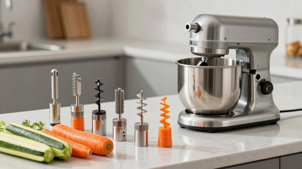 If you’re looking for the best spiralizer attachments for your stand mixer in 2026, I recommend exploring options like the KitchenAid Spiralizer Plus with 7 blades or the multiple-blade attachments compatible with popular models like KSMAPC1AP. These offer versatile slicing, peeling, and spiralizing functions, are made from durable materials, and are dishwasher safe. To find the perfect fit and maximize your kitchen’s potential, check out your options—there’s plenty to discover if you keep going!