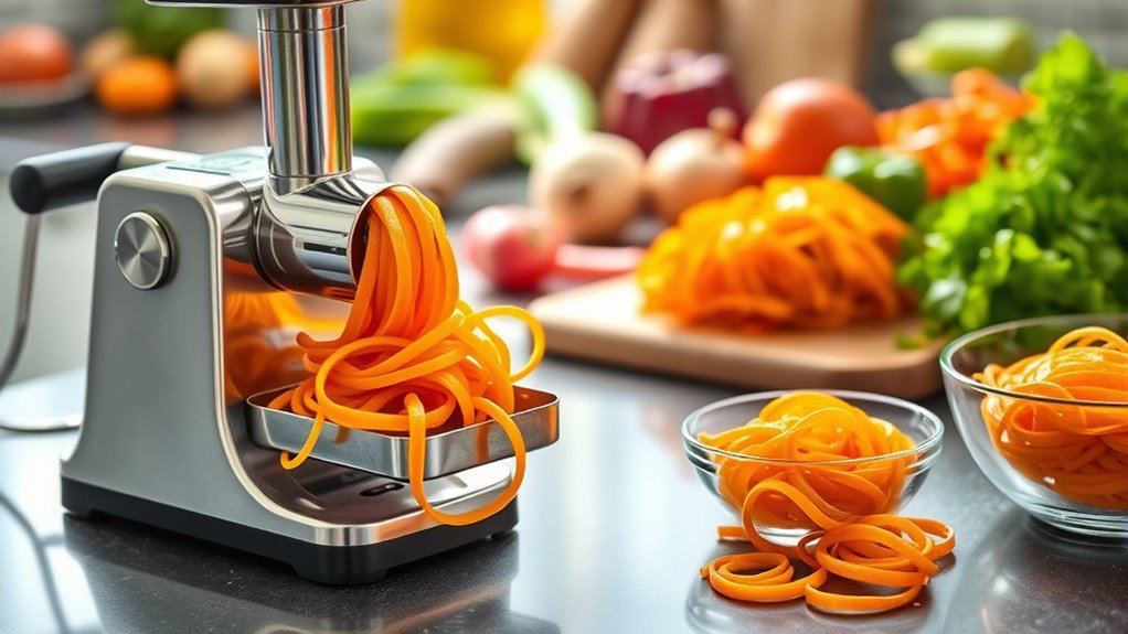 Think of electric spiralizers as the marathon runners of the kitchen—they’re built for endurance. I’ve found they tend to be more durable than manual ones because they’re designed with sturdy motors and materials. Manual spiralizers, like sprinters, are great for quick tasks but may wear out faster with frequent use. If you plan to make spiralized meals often, I recommend investing in an electric model for long-term reliability.