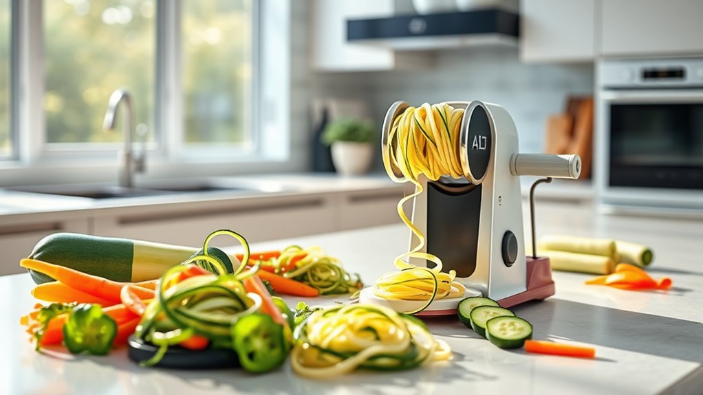 Looking for the best spiralizers with strong suction bases for effortless veggie prep in 2025? I’ve found top options with sturdy suction cups, versatile blades, and durable materials that keep them stable during use. These models are easy to clean, lightweight, and packed with features perfect for home cooks and food enthusiasts. If you want to discover which ones stand out for performance, safety, and convenience, keep going—there’s plenty more to explore.