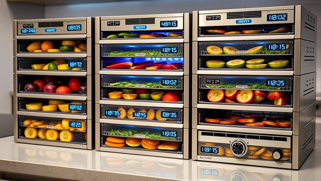A flexible and precise timer is essential for achieving perfect dehydration results, especially when handling a variety of foods. I look for digital timers that offer half-hour or 15-minute increments, allowing me to customize drying cycles accurately. This precision helps prevent over-drying or spoilage. Some models include auto-shutdown or alert functions, so I get notified once the cycle ends, which adds convenience and ensures ideal results. The maximum timer duration varies—some units go up to 48 hours—making them suitable for long processes like jerky or fruit leather. Adjustable timers let me set drying times in advance, reducing the need for constant supervision and giving me peace of mind that my foods will be dried properly without guesswork.