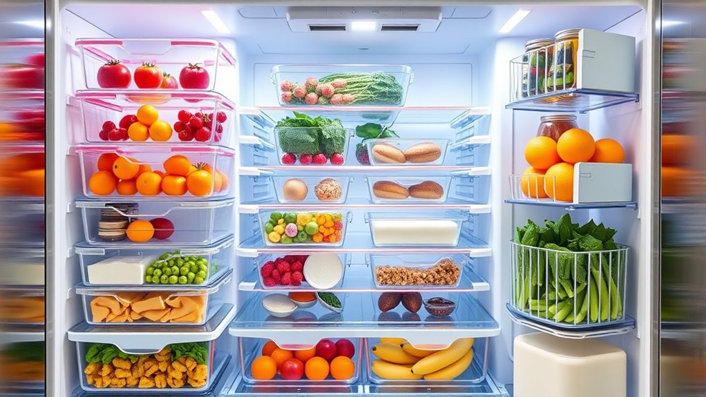 If you’re looking to maximize your kitchen space, I recommend checking out the 11 best stackable fridge organizers. These include versatile options like clear storage bins, metal shelves, and stacking drawers that help you utilize vertical space efficiently. They keep your fridge neat, accessible, and easy to clean. Whether you need bin dividers or durable containers, these options will transform your storage. Keep going to discover more about each of these smart solutions.