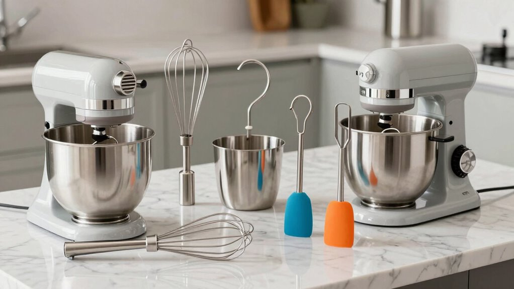 Choosing the right stand mixer accessories set starts with ensuring it’s compatible with your specific model. First, check if the set works with your mixer’s type—tilt-head or bowl-lift. Refer to the manufacturer’s compatibility list to confirm the attachments are designed for your brand and size, whether it’s a 4.5-quart or 6-quart model. It’s also important to verify that the attachments match your mixer’s wattage and design specifications. For example, some accessories are tailored for certain series or model numbers, so double-check those details. Additionally, see if the set includes any adapters or extra parts needed for seamless compatibility. Ensuring these factors will help you avoid issues and guarantee your accessories fit and function properly with your mixer.