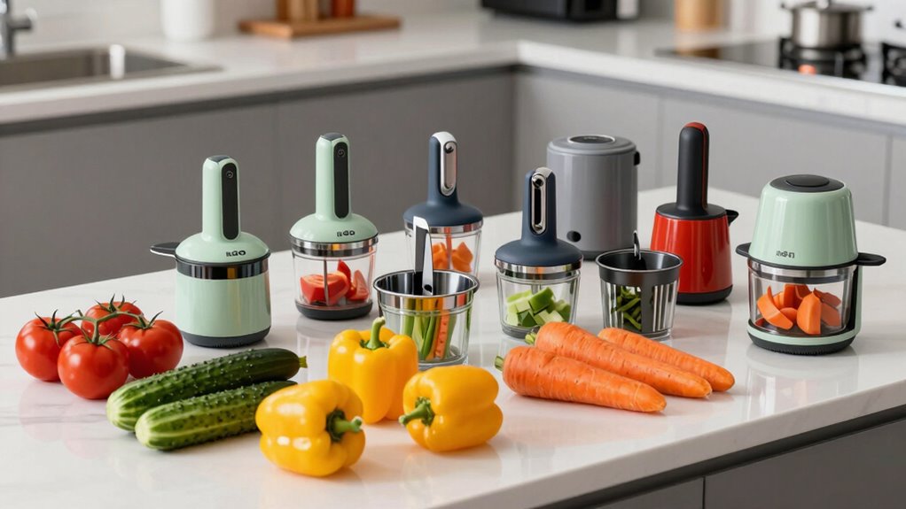 Multi-function vegetable choppers stand out because of their versatility, combining multiple blades and attachments that handle slicing, dicing, shredding, julienning, and grating. This means I can prepare a variety of ingredients with just one device, saving time and counter space. The interchangeable blades make switching between tasks quick and easy, so I don’t need separate tools cluttering my kitchen. Many models also include extra features like egg separators, spiralizers, or graters, broadening their use beyond simple chopping. They can handle vegetables, fruits, cheese, and nuts, making meal prep more efficient. By consolidating multiple functions into one device, I streamline my workflow and reduce cleanup, which is especially helpful during busy weeknights or when prepping for large meals.