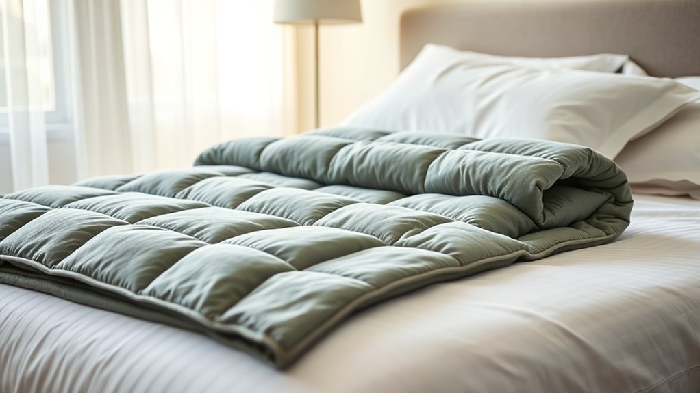 Breathability and temperature regulation are essential factors to contemplate because they directly affect your comfort and ability to relax while using a weighted blanket. Breathable fabrics like cotton, linen, or microfiber help keep you cool by allowing air to circulate and prevent overheating. Blankets with cooling glass beads or moisture-wicking materials improve airflow and reduce heat retention, making them suitable for warmer months. Reversible or dual-sided designs let you switch between warmer and cooler surfaces depending on the season. Proper weight distribution and open-weave constructions also enhance breathability by promoting airflow. Avoid heavy, non-porous fabrics that trap heat, as they can cause discomfort and interfere with the calming effects you seek from your weighted blanket.