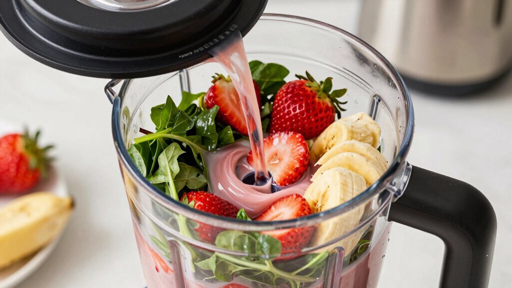 Choosing the right blend cycle is essential to achieve the smooth, consistent texture desired in smoothies and beverages. For ideal blend cycle selection, opt for cycles designed specifically for liquids or smoothies. These cycles typically feature shorter, pulsating actions that break down ingredients efficiently without over-processing. Beverage blending tips include starting with liquids, then adding solids gradually, and using the appropriate cycle for a silky finish. Many Blendtec models offer dedicated smoothie or beverage cycles that provide the perfect blend of power and duration. Use these cycles to blend ingredients until smooth, ensuring no chunks remain. Avoid over-blending, which can heat or thin your drink. Additionally, understanding the powerful motor of your blender helps you select the right cycle for optimal results. By selecting the right cycle, you’ll consistently produce beverages with a professional, restaurant-quality texture.