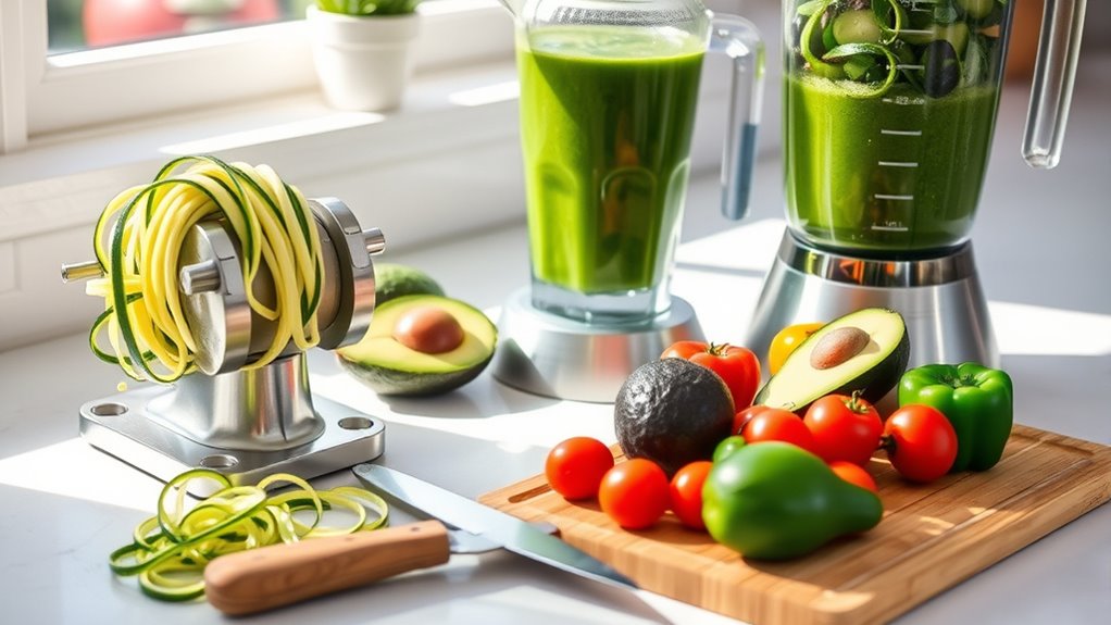 Creating a raw food kitchen requires more than just fresh ingredients; having the right tools can make preparing and enjoying raw meals much easier. One of the most versatile tools you’ll want to master is the blender. With the right blender techniques, you can whip up smoothies, sauces, nut butters, and even raw soups quickly and efficiently. To get the best results, ensure your blender has a powerful motor and sharp blades. When blending tougher ingredients like nuts or fibrous vegetables, start on a low setting and gradually increase speed. Use pulsing techniques to control texture, and don’t hesitate to stop and scrape down the sides to achieve a smooth consistency. Over time, learning these blender techniques will help you create a variety of raw dishes with ease, saving time and minimizing frustration. High-quality blenders are especially important for achieving optimal results in raw food preparation.