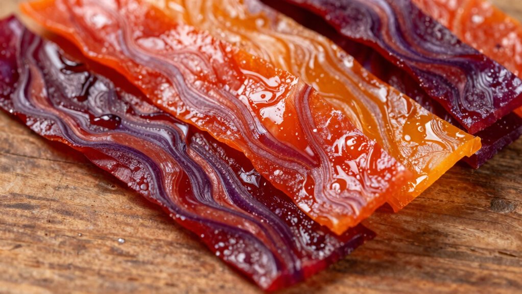 When your fruit leather develops a sticky, overly soft, or brittle texture, troubleshooting becomes essential to pinpoint the cause and correct it. To fix sticky or overly soft leather, focus on texture adjustments by reducing moisture during blending or drying. Too much moisture prevents proper setting, so increase drying time or lower humidity in your environment. Conversely, if the leather is brittle, it likely has too little moisture. You can soften it by lightly rehydrating with a small amount of fruit juice or water and gently reheating. Proper moisture control is key throughout the process; ensure your fruit purees are not overly wet and that you dry the leather evenly. Making these adjustments helps you achieve the perfect, chewable texture every time.