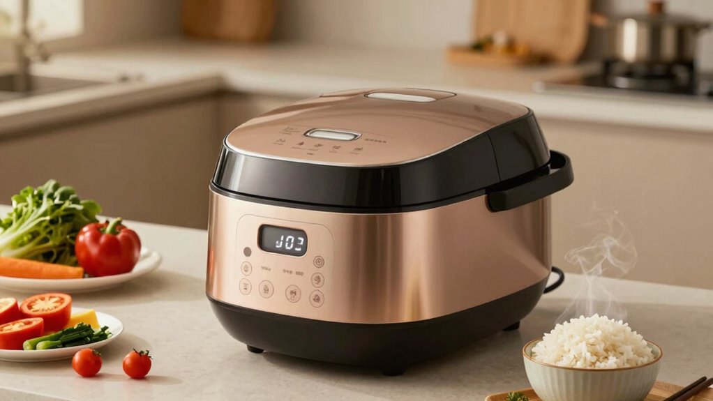 When choosing a rice cooker for your vegan kitchen, understanding the difference between fuzzy logic models and traditional ones can substantially impact your cooking results. Fuzzy logic rice cookers adjust temperature and cooking time dynamically, ensuring perfectly cooked rice every time, which enhances flavor pairing and complements your plant-based dishes. They also offer precise control, making it easier to achieve the ideal texture for varieties like quinoa or wild rice. Traditional cookers rely on simple on/off mechanisms, which can lead to inconsistent results and less attention to nuanced flavors. Additionally, fuzzy logic models often feature sleek designs that boost kitchen aesthetics, aligning with modern, minimalist setups. Overall, fuzzy logic rice cookers provide a smarter, more adaptable choice for vegans who value consistent quality and culinary harmony.