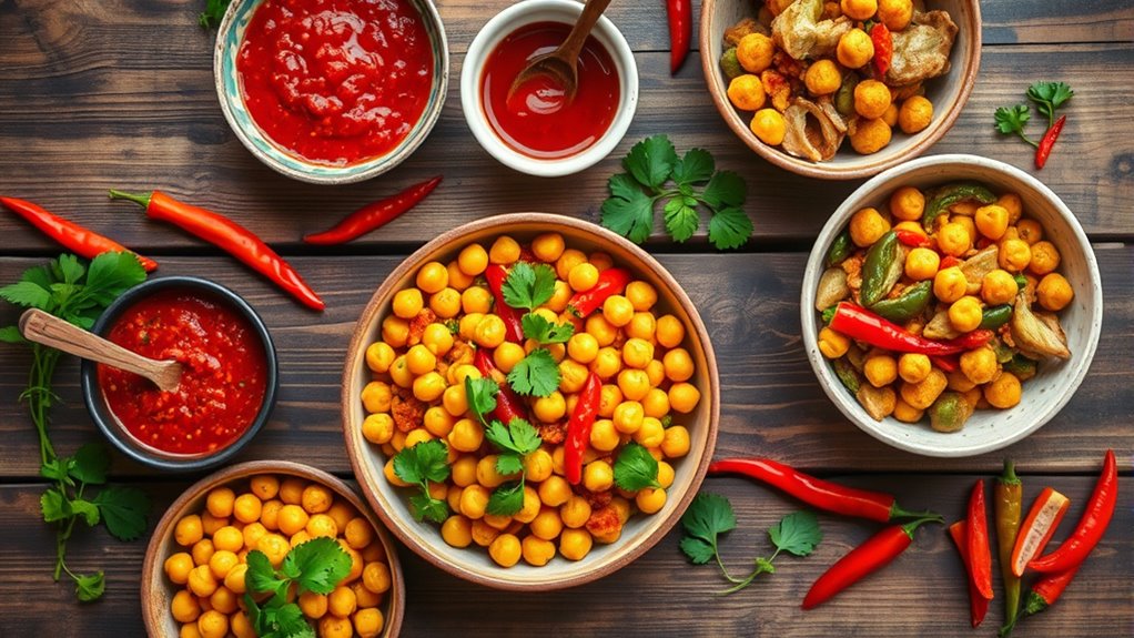 You can pair spicy sauces with vegan proteins like tofu stir fry and chickpea curry. Tofu absorbs flavors well, making it perfect for spicy global sauces, while chickpeas add texture and protein. Try coating tofu in a spicy sauce before stir-frying or mixing chickpeas into a curry for added heat. These combinations boost flavor and nutrition, creating satisfying, spicy vegan dishes.