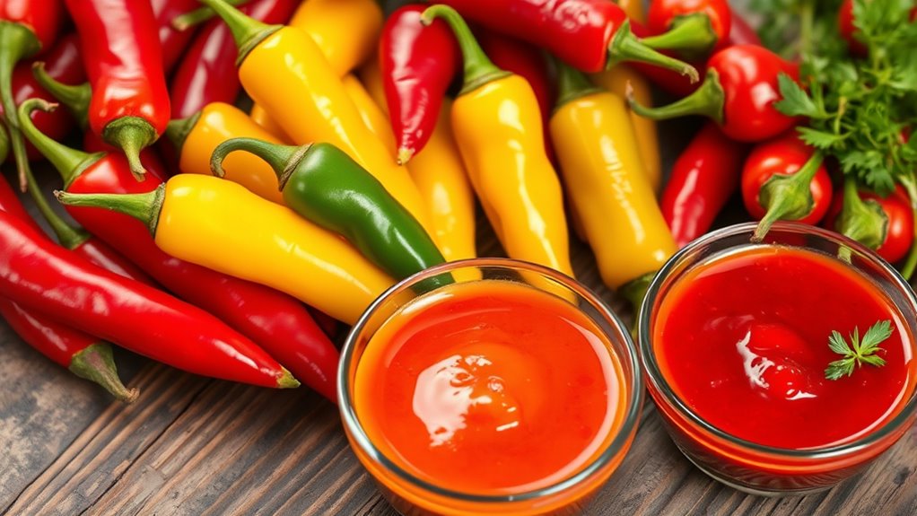 Spicy peppers and sauces boost your health by increasing metabolism, helping with weight management, and supporting fat burning. They also reduce inflammation, ease pain, and promote better circulation for heart health. Plus, they aid digestion and protect cells with their antioxidant properties. If you want to explore how incorporating these fiery foods can benefit your overall well-being, you’ll find even more insights as you continue.