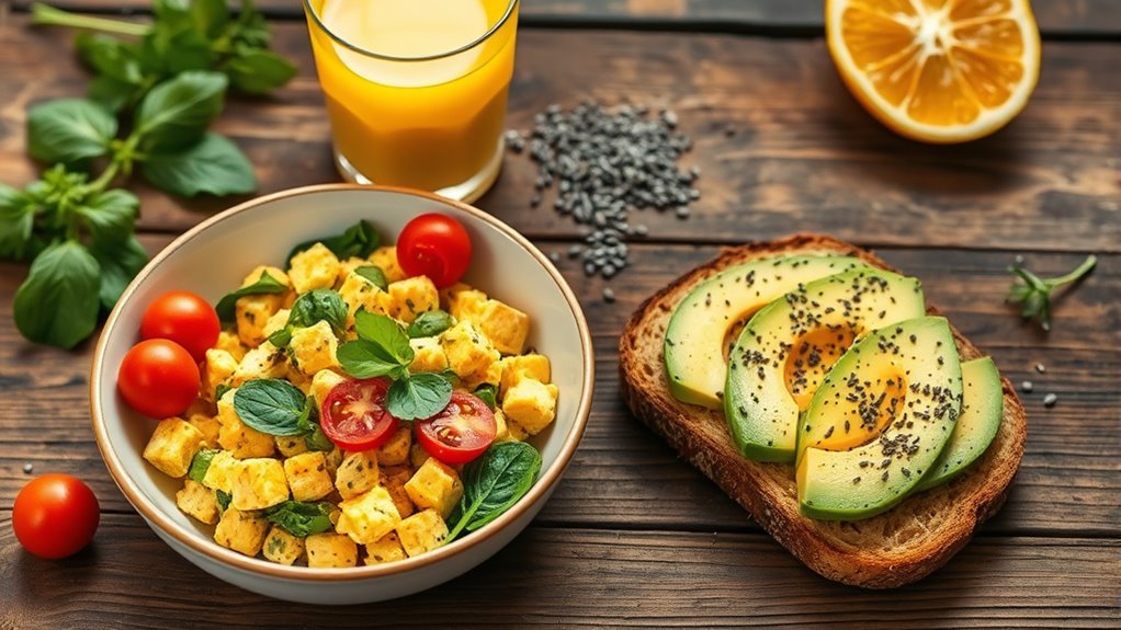 For a high-protein vegan breakfast, try blending a smoothie bowl with plant-based milk, frozen fruits, and topping it with chia seeds, nuts, or hemp seeds for extra protein and texture. Alternatively, make a quick tofu scramble with vegetables and flavorful seasonings like turmeric and nutritional yeast. Both options are nutrient-dense and easy to prepare, perfect for busy mornings. Keep exploring for more tasty tips and ideas to start your day energized and healthy.