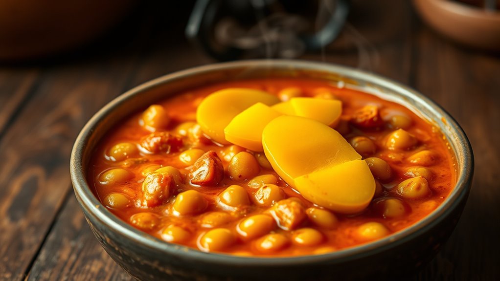 Have you ever tried combining the creamy richness of chickpea curry with the sweet, tangy flavor of mango? If not, you’re missing out on an incredible flavor pairing that balances warmth and brightness perfectly. When making this dish, your choice of spice combinations plays a essential role. You want to select spices that complement both the hearty chickpeas and the sweet mango. Ground cumin and coriander add earthy depth, while a pinch of turmeric introduces a subtle warmth and vibrant color. For a slight heat, incorporate chili powder or cayenne pepper, but remember to adjust according to your spice tolerance. Garnishing with freshly chopped cilantro and a squeeze of lime can elevate the dish’s freshness, tying all the flavors together.