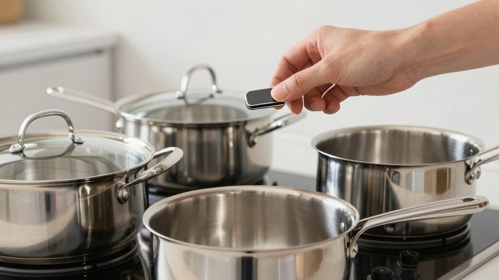 To determine if your pots and pans work with induction cooktops, a simple test can save you time and money. The magnet test is quick: if a magnet sticks firmly to the bottom, your cookware is likely compatible. Besides functionality, consider cookware aesthetics, as attractive designs enhance your kitchen decor. Brand reputation also matters; trusted brands often ensure consistent quality. You can also check for induction symbols on the bottom of your pots and pans or review packaging information. Here’s a quick overview: