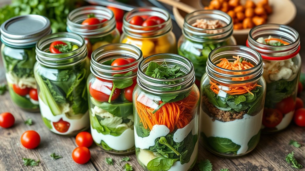 Mason jar salads make portable, grab-and-go meals easy and customizable. You can layer ingredients with dressing at the bottom, hearty veggies in the middle, and greens on top to keep everything fresh. They’re perfect for busy days, letting you prep meals ahead and enjoy them anytime. Proper layering and storage help maintain flavor and crunch. Keep exploring for more tips on creating delicious, long-lasting mason jar salads tailored to your tastes.