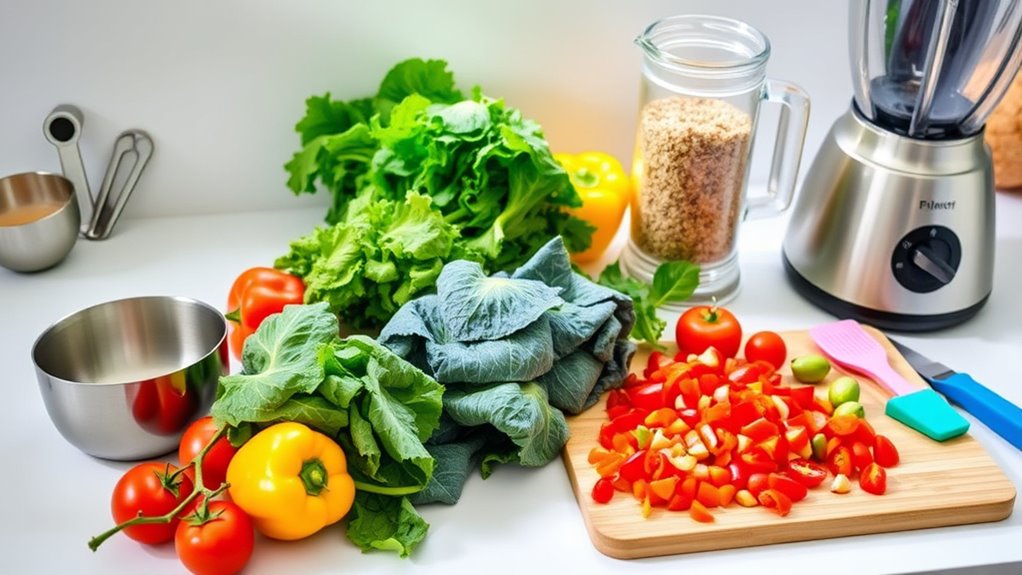 To start meal prep easily, gather key tools like airtight containers, portioning bags, a digital scale, and reheatable cookware. Focus on simple, versatile recipes that store well in bulk, and plan your grocery list carefully. Batch cooking saves time and helps control portions, reducing waste and overeating. By organizing these basics, you’ll build a smooth routine that keeps healthy meals ready — and there’s plenty more to discover as you continue!