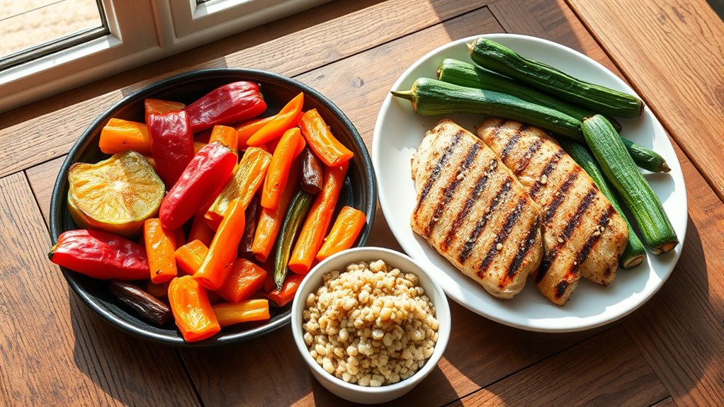 You can guarantee balanced nutrition in your meal prep by practicing portion control and aiming for micronutrient balance. Fill your plates with a variety of colorful vegetables, lean proteins, whole grains, and healthy fats to cover essential nutrients. Measure servings to avoid overeating and include different food groups to meet your vitamin and mineral needs. This approach keeps your meals both satisfying and nutritionally complete for sustainable weight management.