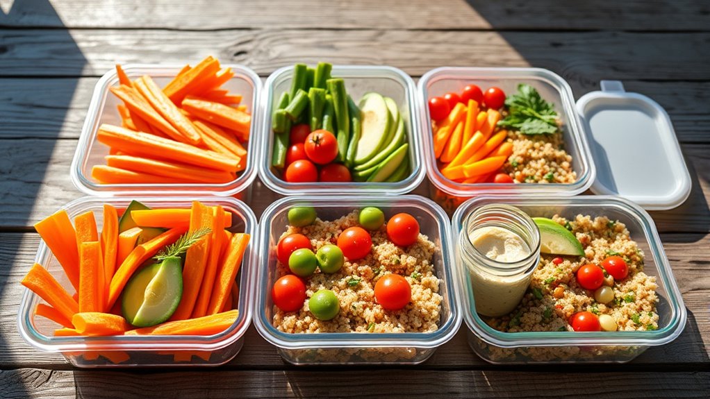 To keep your vegan meals flavorful and fresh during long trips, focus on flavor preservation and freshness maintenance. Pack airtight containers to prevent spills and preserve taste. Use herbs, citrus, or vinegar to boost flavor without adding moisture that spoils. Keep meals chilled with insulated bags, and consider freezing some items beforehand. Reheat safely if possible, and consume your meals within a recommended timeframe to enjoy best flavor and freshness.