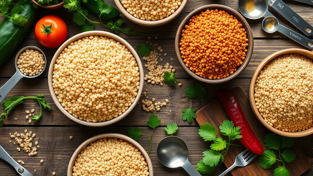 You can elevate your meal prep by incorporating ancient grains like teff and millet, which offer rich flavor, nutrition, and versatility. Cook large batches of these grains and use them as a base for salads, grain bowls, or stir-fries. Their naturally gluten-free and plant-based protein properties make them ideal for various dietary needs. Experiment with herbs, spices, and toppings to keep your meals interesting—if you keep going, you’ll discover even more tasty and wholesome ideas.
