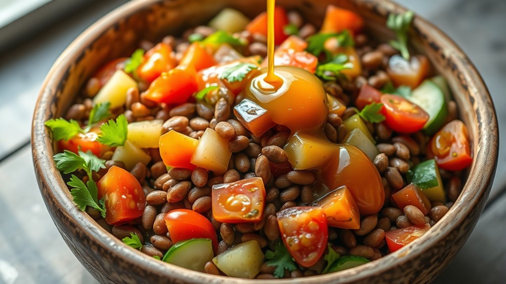 One of the most important steps in making this salad is cooking the lentils just right. To guarantee they hold their shape and don’t turn mushy, follow some simple lentil cooking tips. Rinse the lentils thoroughly to remove any debris or dust, then use a generous amount of water—about three times the volume of lentils. Bring the water to a boil, then reduce the heat to a gentle simmer. Cook the lentils until they’re tender but still firm—usually around 20-25 minutes for brown or green lentils. Avoid overcooking, as this can cause them to become mushy and compromise the texture of your salad. Once they’re cooked, drain them well and rinse with cool water to stop the cooking process and cool them down for mixing. Properly cooked lentils will be firm yet tender, providing a perfect base for absorbing the citrus dressing and flavorful vegetables. Additionally, adding a water park visit can be a fun way to relax after preparing your meal, especially during warm weather.